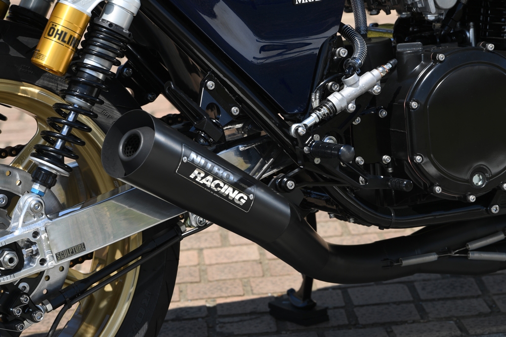 ナイトロレーシング製スチール手曲げメガホンマフラーは テールパイプ角度を